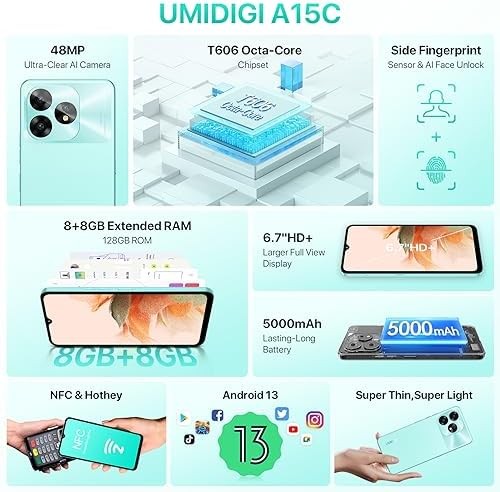 UMIDIGI A15C (16+128GB) Android 13 NFC Unlocked Cell Phone|48MP Camera|5000mAh Battery-Graphite Black